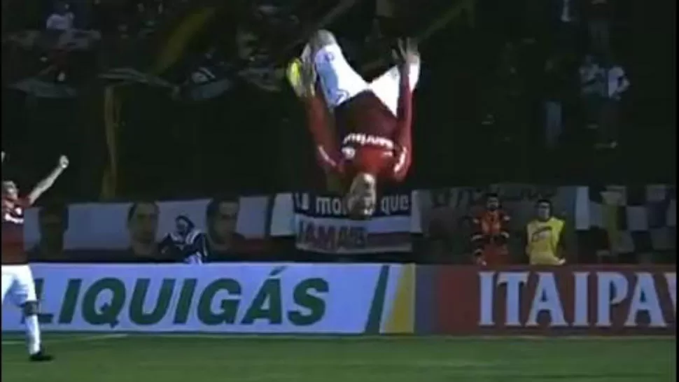PORTUGAL.- No siempre los festejos salen bien. Sino fiíjense lo que le pasó a Roque Junior Maurides del Internacional de Porto Alegre, el delantero de 19 años cuando marcó su primer gol. El jugador quiso celebrarlo con una pirueta pero cayó mal y tuvo que ser retirado en camilla.
