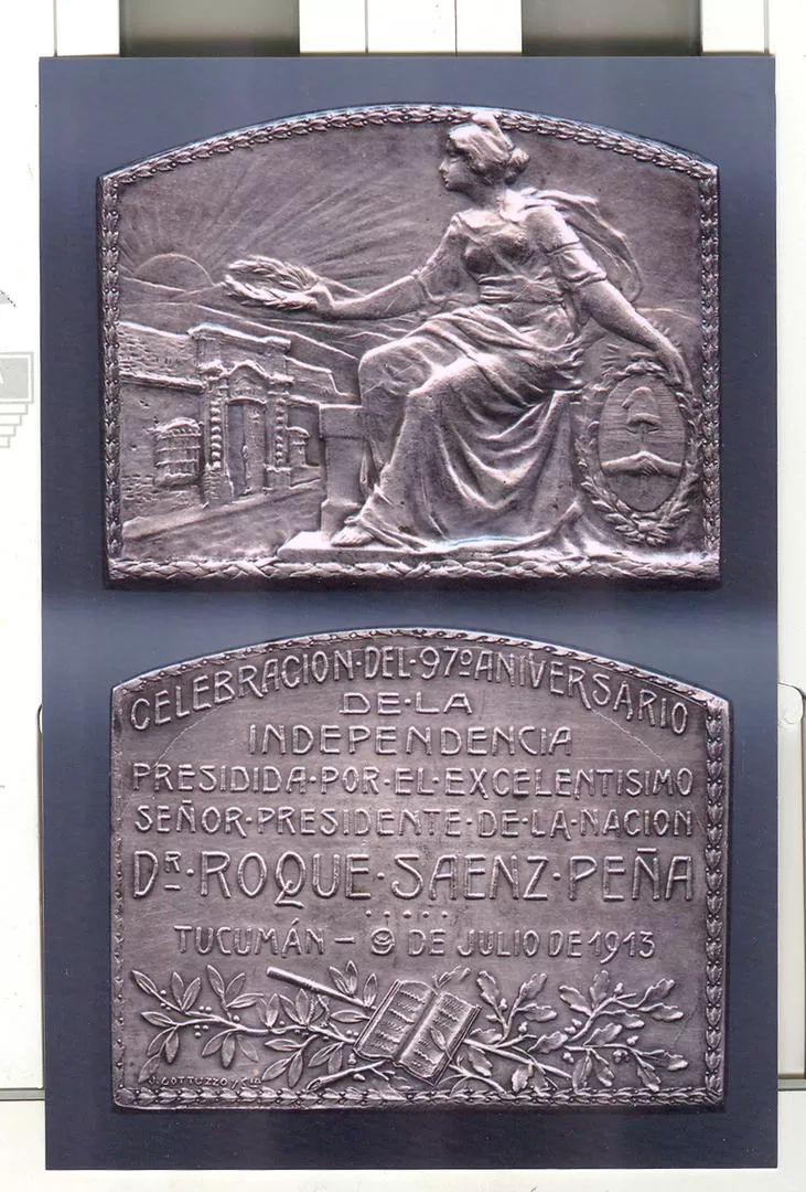 Tampoco creemos conocida la plaqueta que ilustra esta nota, y que se acuñó con motivo de la última visita del presidente, hace un siglo. Lleva en el anverso una figura femenina que aferra el escudo y extiende una corona de laurel a la Casa Histórica. En el reverso, se lee: "Celebración del 97 aniversario de la Independencia, presidida por el Excelentísimo Señor Presidente de la Nación, Dr. Roque Sáenz Peña. Tucumán, 9 de julio de 1913".
