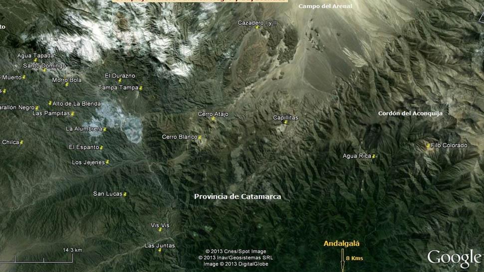 ZONA MINERA. Cerro Atajo queda a 10 kilómetros de Bajo La Alumbrera y a 25 de Agua Rica. FOTO TOMADA DE GOOGLE EARTH