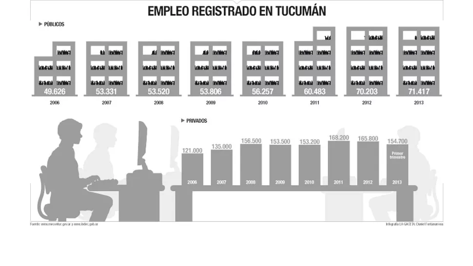 El Estado fue más dinámico que las empresas a la hora de generar puestos de trabajo en Tucumán. Y eso se puede observar con la evolución que tuvo el plantel del sector público provincial durante los últimos años. Tomando como punto de partida el dato presupuestado en 2006, podemos decir que el empleo estatal ha crecido casi un 44%. Mientras que en las empresas radicadas en la provincia se ha expandido en torno de un 28%. Desde la gestión del gobernador José Alperovich se argumenta que la mayor demanda de trabajadores responde a la necesidad de la población de contar con más servicios. En ese sentido, gran parte de los puestos creados en el Gobierno fueron para las áreas de seguridad y de salud. El sector privado, en tanto, ha tenido sus etapas. Hasta 2011, la construcción y el comercio fueron las actividades que demandaron más mano de obra. La desaceleración económica frenó la tendencia.El sector público le gana la carrera a las empresas en la creación de empleos