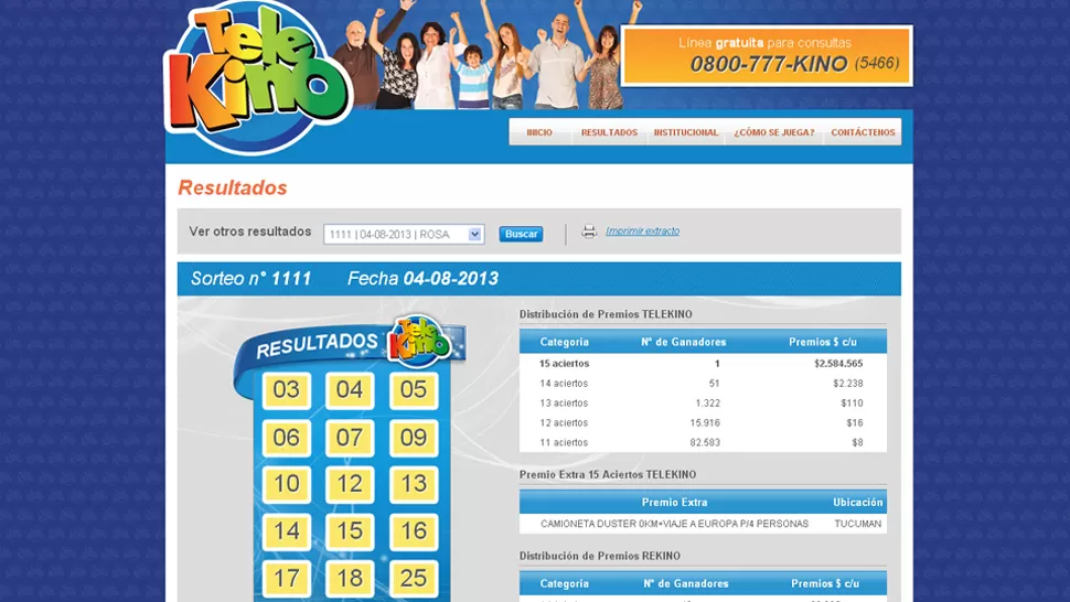 De la noche a la mañana, se hizo millonario. Un tucumano ganó $ 2,5 millones luego de que salieran sorteados los 15 números de su cartón del Telekino, juego de azar emitido por la Caja Popular de Ahorros de Tucumán. El afortunado fue premiado, además, con una camioneta Duster 0 Km y un viaje a Europa para cuatro personas, según consta en el