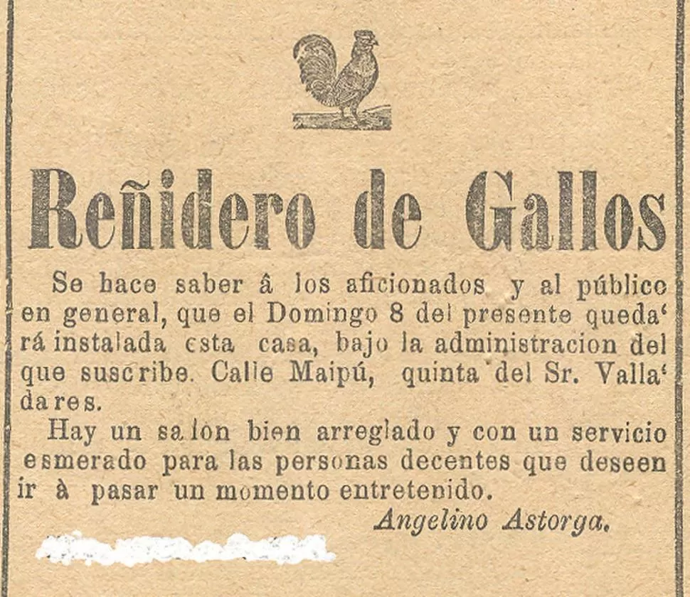 PARA LOS "GALLEROS". En un aviso periodístico de 1887, Angelino Astorga informaba la apertura de un reñidero en la Quinta de Valladares. LA GACETA / ARCHIVO