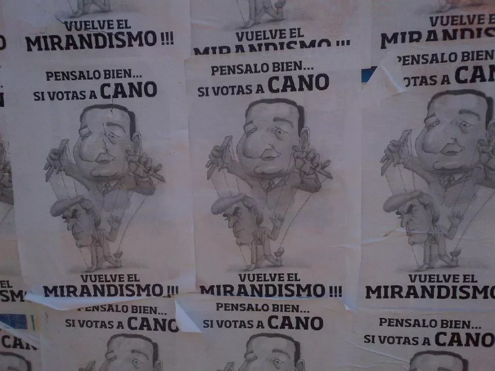 El período de campaña electoral comenzó a percibirse en las calles de la ciudad. Tras el fin de semana, sorprendió una pegatina de afiches en contra del senador José Cano, candidato a diputado por el Acuerdo Cívico y Social (ACyS). En los carteles, sin firma que identifique al autor, se relaciona al nuevo espacio opositor con el ex gobernador peronista Julio Miranda (1999-2003). Esto, en alusión a que en el ACyS militan peronistas disidentes que integraron la gestión mirandista: Alejandro Sangenis, Alberto Darnay, Enrique Romero y Antonio Guerrero (se sumó recientemente). En la última sesión legislativa, el legislador y postulante a diputado Ricardo Bussi (Fuerza Republicana) denunció los vínculos entre peronistas disidentes y el radical Cano.