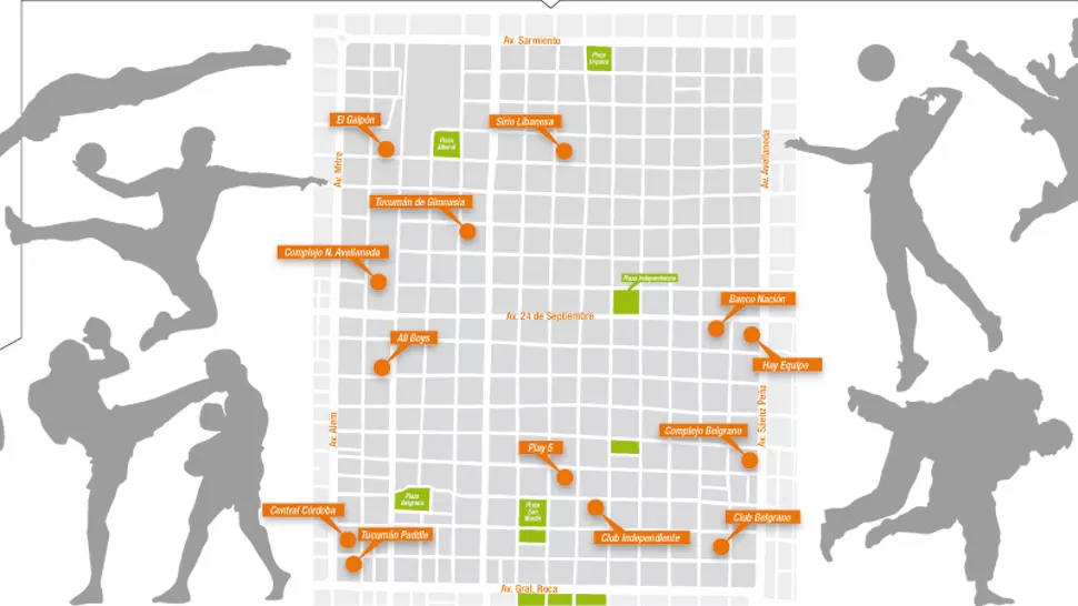 Hay mucho cemento y asfalto, además de una concentración de actividades económicas, sociales, jurídicas y de gobierno. Pero pese a que el paisaje urbano no es el mejor como para pensar en la práctica deportiva, igual la zona interna que se conforma entre las cuatro avenidas en San Miguel de Tucumán cuenta con una buena cantidad de ofertas que son aprovechadas en buen grado por quienes habitan en el centro y en zonas aledañas.