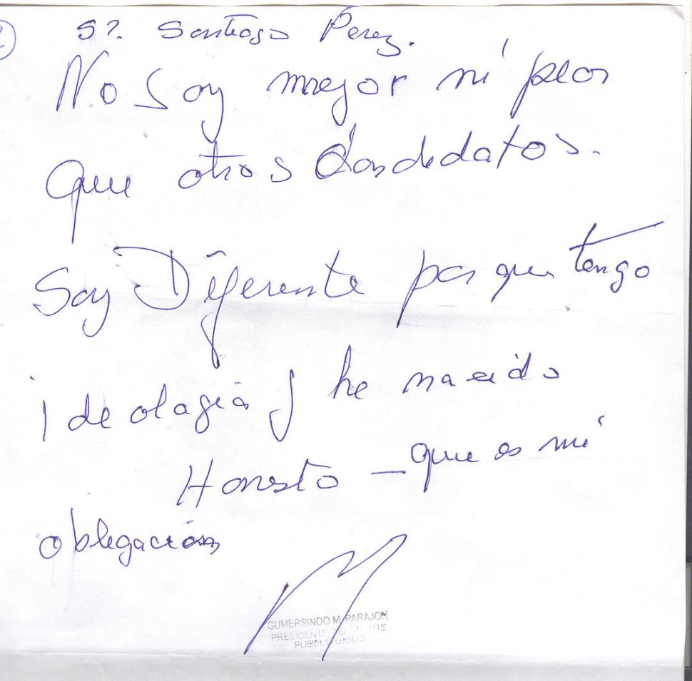 Mucha excitación interna, propio de las personas de temperamento sanguíneo, todo lo "siente". De juicio independiente, perceptivo, deseo de poder -letra "t" con barra en diagonal y larga-. Apasionado en lo que hace, aunque su estado anímico muchas veces decae cuando no consigue el objetivo deseado. Le gusta diferenciarse de los demás: "diferente"; "no soy" tiene una carga emocional distinta y se lo ve en el tamaño. Muchas veces las experiencias del pasado no le sirvieron y vuelve a cometer los mismos errores -letras inferiores abiertas que no llegan a la zona media-. Disfruta de los placeres de la vida. Coqueto.