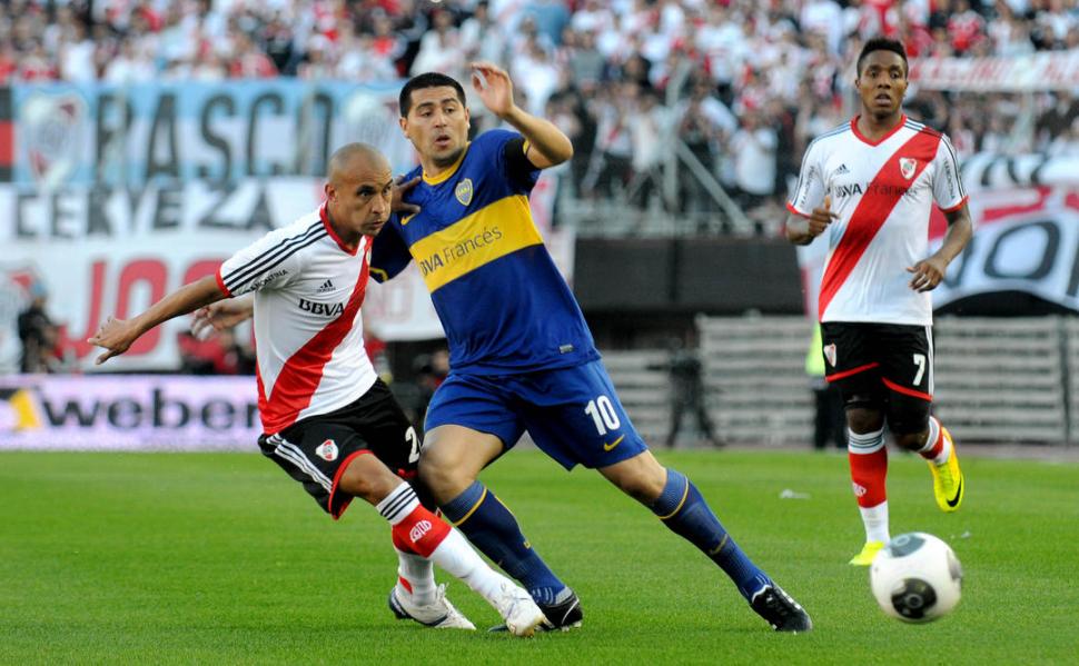 POCO Y BUENO. Riquelme, que intenta anticiparse a la marca de Ledesma, no estuvo en su plenitud, pero igual aportó su calidad para complicar a los "millonarios".