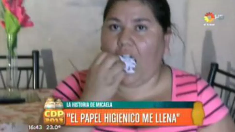 La paciente, de nombre Micaela, comió papel higiénico ante las cámaras y contó: "El papel higiénico me quita el apetito, siento que me llena. A veces puede ser un rollo, a veces uno y medio. En tres horas me termino uno. Lo hacía a escondidas antes y lo sigo haciendo ahora. Mi hija duerme y mientras miro la tele, me acuesto en la cama y como papel higiénico".