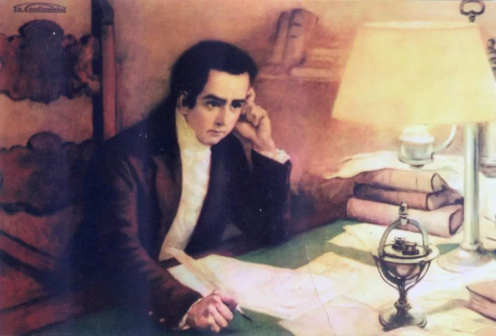 MARIANO MORENO. El óleo de Subercaseaux lo retrató en su escritorio de secretario de la Primera Junta. A la derecha se ve su tintero, que conserva el Museo Histórico Nacional