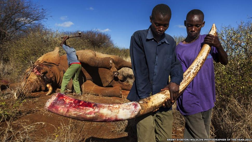 También el sudafricano Brent Stirton ganó el premio al mejor fotoperiodista de la vida silvestre. Su imagen fue tomada en el Parque Nacional Amboseli, en Kenia. Un guardia del parque vestido de civil reacciona a la muerte de un elefante quitándole los colmillos al amanecer, para evitar que se lo lleven los cazadores furtivos. Este animal murió de un golpe de lanza. La mayoría cae por heridas de bala.
