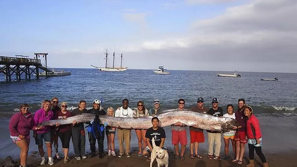 CALIFORNIA, Estados Unidos.- Las imágenes son impactantes. El cadáver de un "monstruo marino" de cinco metros y medio de largo fue hallado en las aguas del sur de California. Un total de 15 personas fueron necesarias para retirar los restos de un pez sable (o remo), con el que posaron sosteniéndolo en sus brazos antes de trasladarlo a la localidad de Santa Mónica.