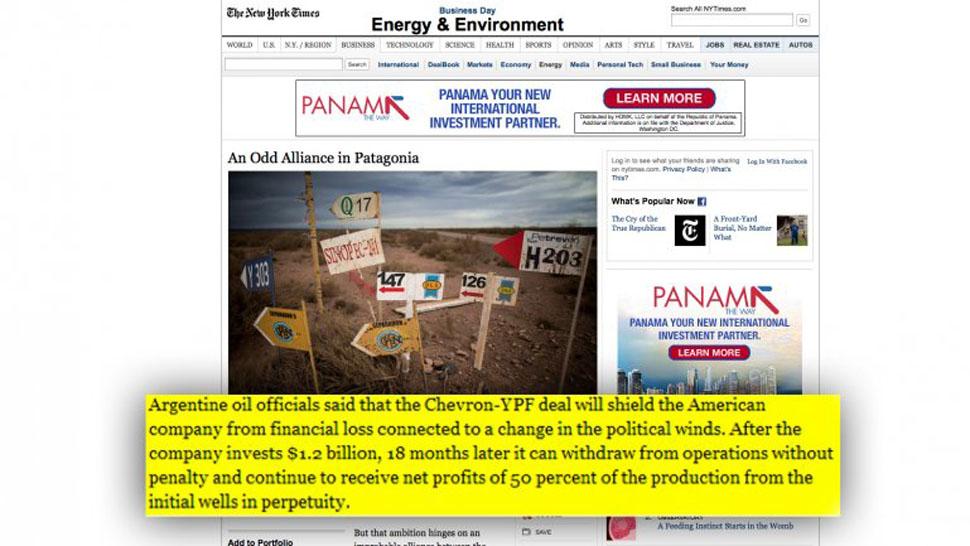 "Si la compañía invierte U$S 1.200 millones puede retirarse 18 meses más tarde de la operación, sin penalidad alguna, y continuará recibiendo los beneficios netos del 50% de la producción de los pozos iniciales a perpetuidad", reveló el NYT.