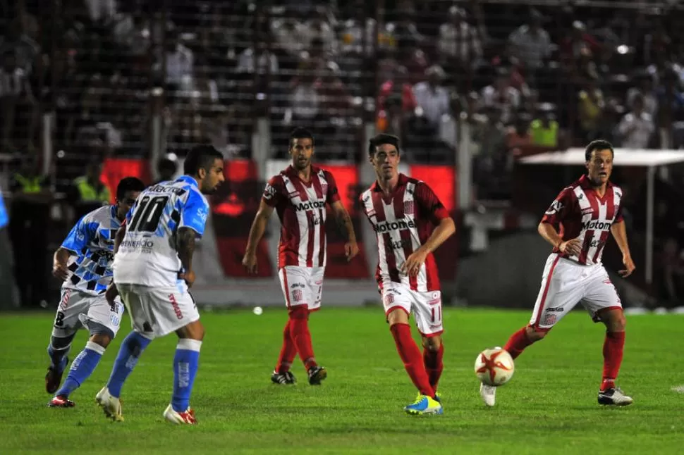 APROBADO. Leandro de Muner -en el medio- cumplió un buen trabajo en su primer partido de titular en los "santos". En la escena aparece con Bruno Lescano (11).