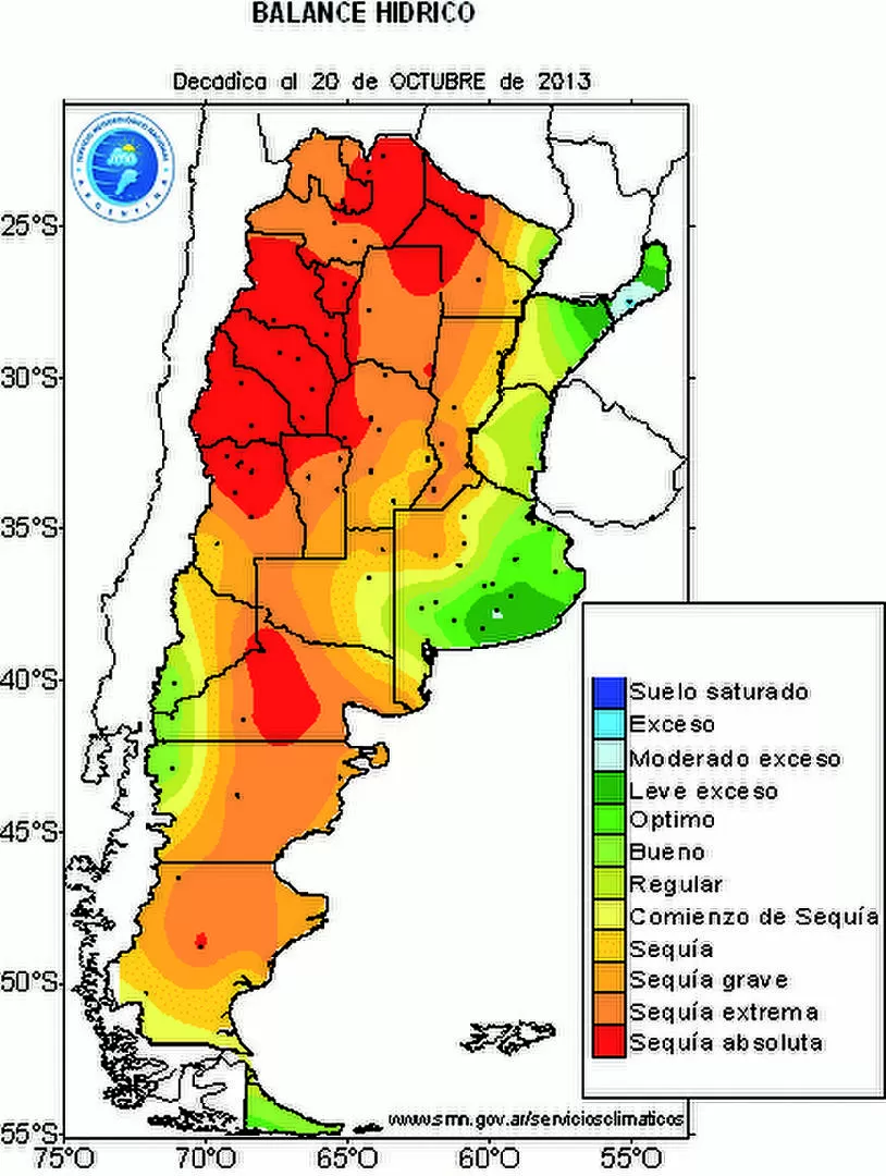 "La condición hídrica de los suelos de la Argentina sigue siendo preocupante". Esta afirmación del pertenece a Mauricio César Costa, profesor Asociado de 'Climatología y Fenología Agrícola' de la Facultad de Agronomía y Zootecnia (UNT) y subdirector del Laboratorio Climatológico Sudamericano, se fundamenta en el último informe del Servicio Meteorológico Nacional, donde muestra el mapa de Balance Hídrico de Suelos, al 20 de Octubre de 2013 (ver imagen)