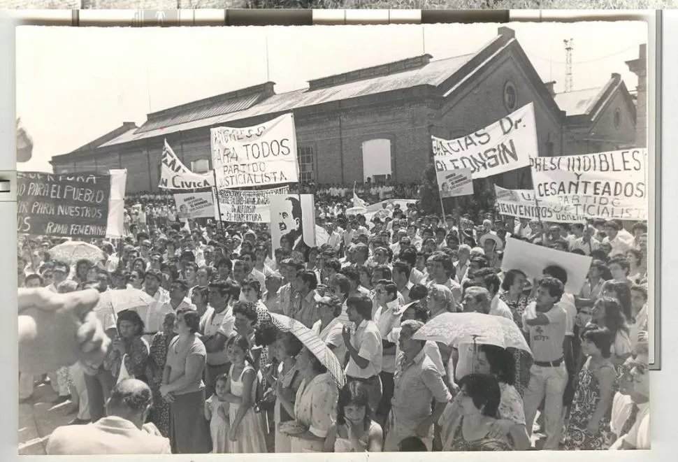 LA GACETA del 4 de agosto de 1984 -ejemplar del 72° aniversario de nuestro diario- consignaba que el primer mandatario llegó hasta el playón de los talleres en el tren presidencial. "Alfonsín arribó al lugar acompañado por el gobernador Fernando Pedro Riera, junto a la comitiva nacional, legisladores e invitados especiales. La presencia de banderas y carteles de peronistas, radicales, comunistas, intransigentes y de las Madres de Plaza de Mayo daban un marco multicolor".