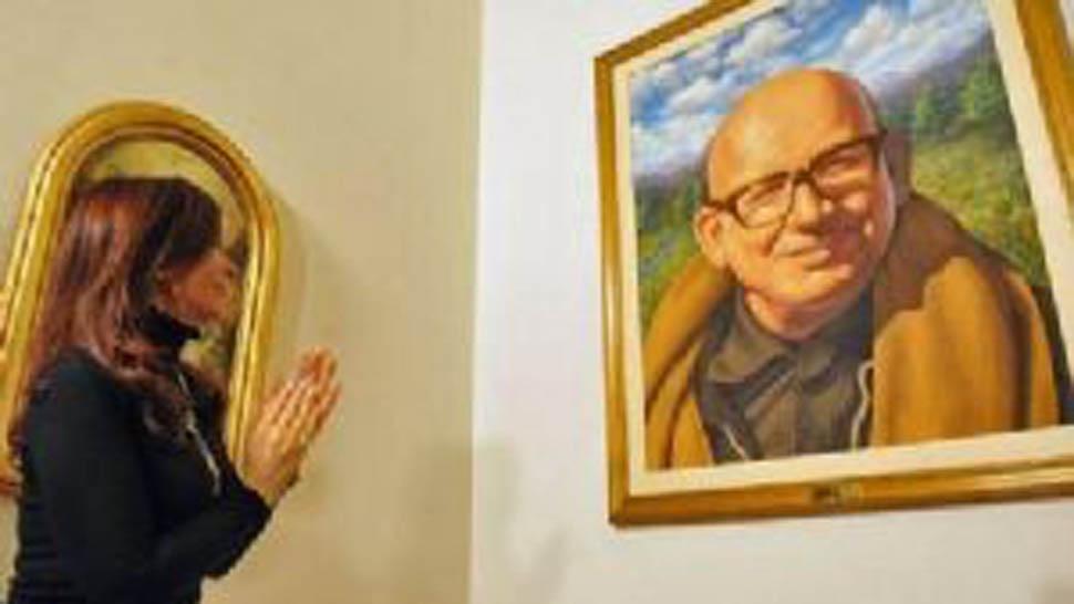 FINALMENTE. La Presidenta mira un retrato del obispo Angelelli, asesinado hace 40 años. FOTO ARCHIVO