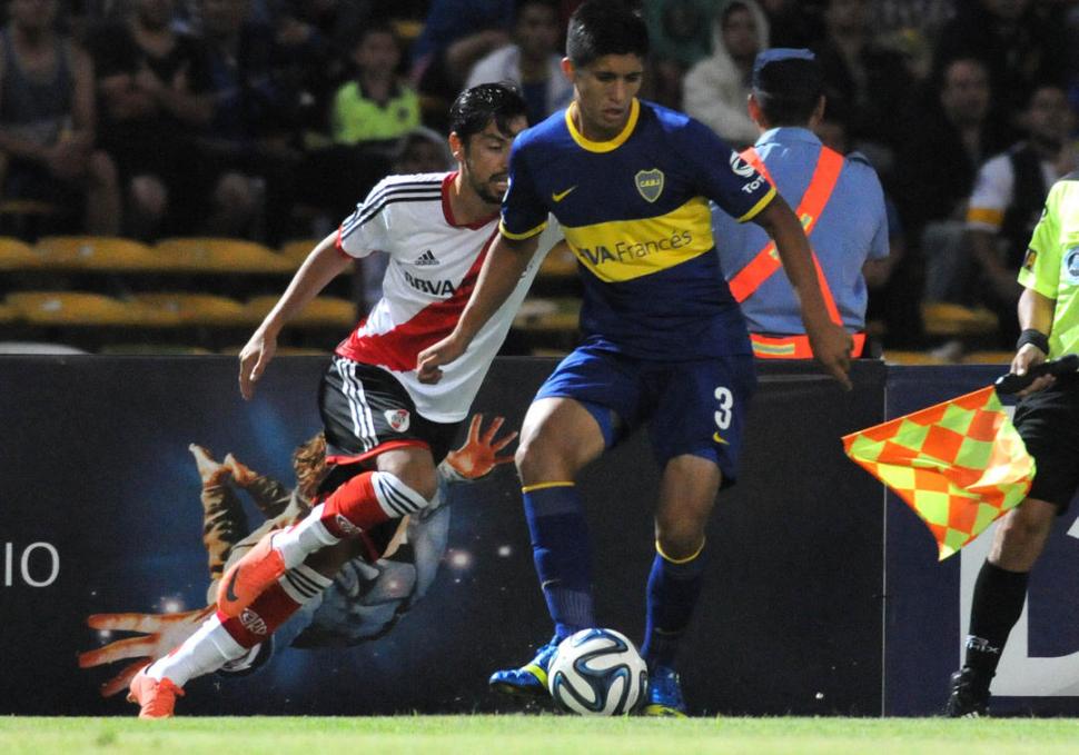 NUEVA CHANCE. Zárate deja en el camino a Menseguez, que convirtió el segundo tanto de los “millonarios”. El “Rayo” respondió a la confianza que le dio Ramón Díaz.