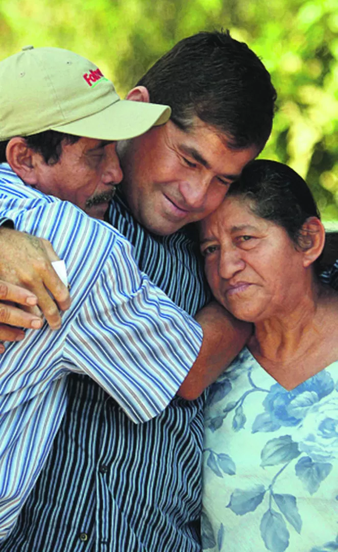 El náufrago salvadoreño José Alvarenga, quien permaneció 13 meses a la deriva en el océano Pacífico, abandonó el martes el hospital después de una semana de evaluaciones médicas. Acompañado por su padres (foto), Alvarenga enfatizó que no volverá a navegar.