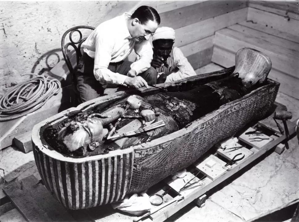 LA MOMIA. Carter y uno de sus ayudantes, trabajan sobre el sarcófago que contiene los restos del faraón. archivo LA MOMIA. Carter y uno de sus ayudantes, trabajan sobre el sarcófago que contiene los restos del faraón. archivo