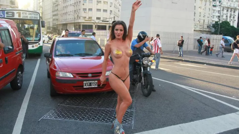Mientras los automovistas que circulaban por el lugar miraban atentos, Diarco se paseó sosteniendo una pancarta, y vestida con una micro tanga y un corpiño que luego se quitó para realizar un audaz topless que, de milagro, no ocasionó choques en la zona.