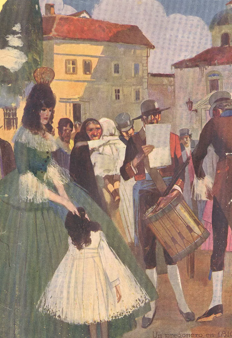 UN PREGONERO EN 1816. Un estilizado dibujo de Alonso, en “Caras y Caretas” de 1917, reconstruye la lectura de un bando en tiempos de la Independencia. la gaceta / archivo
