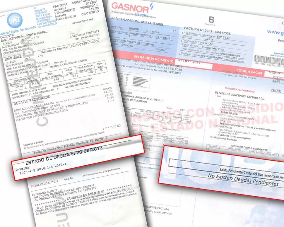 En este rubro están incluidos el agua, el gas, la luz y la telefonía fija. Una práctica común es guardar las facturas pagadas durante cinco años, porque si la empresa no hizo ningún trámite para cobrar la deuda durante ese tiempo, la obligación prescribe y no se puede reclamar judicialmente. Sin embargo, no es necesario guardar todas las facturas; basta con tener la última. La ley 24.240, en su artículo 30 bis, establece: “Las constancias que las empresas prestatarias de servicios públicos, entreguen a sus usuarios... deberán expresar si existen períodos u otras deudas pendientes, en su caso fechas, concepto e intereses si correspondiera, todo ello escrito en forma clara y con caracteres destacados. En caso que no existan deudas pendientes se expresará: “no existen deudas pendientes”. La falta de esta manifestación hace presumir que el usuario se encuentra al día con sus pagos...” Gasnor, Telecom y la SAT cumplen con esta medida. En las boletas de telefónica y en las de EDET no se hace esa aclaración. Pero, en ambos casos, el servicio se corta si no se paga. Telefónica espera un tiempo, EDET cumple la fecha de corte establecida.