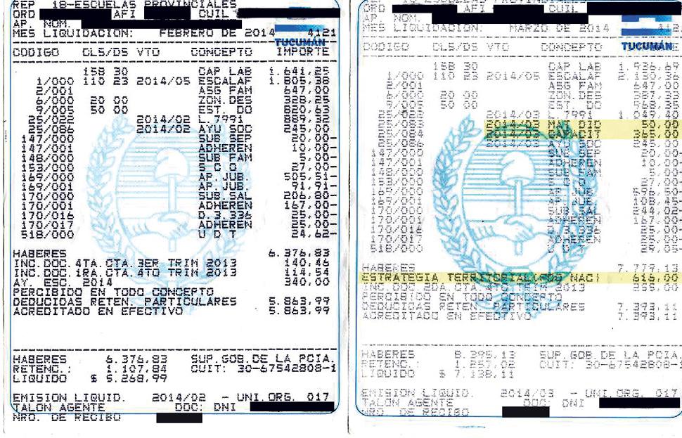FEBRERO Y MARZO. En la boleta de sueldo de la derecha se incluyen tres ítems que los docentes ya cobraban. FEBRERO Y MARZO. En la boleta de sueldo de la derecha se incluyen tres ítems que los docentes ya cobraban.