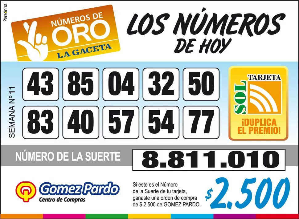 Números de Oro Los Números de Oro de LA GACETA Compartir Whatsapp Facebook X Copiar dirección URL 08 Mayo 2014 Seguir en Esta nota es de acceso libre. Tamaño texto Comentarios NOTICIAS RELACIONADAS La grilla completa de los Números de Oro de la semana N° 11 Lo más popular “Soy el presidente que menos gana en América”, dijo Milei en la cena de la Fundación Libertad Cuando el principal obstáculo no es el dinero: la clave para acceder a la casa propia en 12 meses Juicio por el caso Lebbos: “¿Quién encubriría a un sanguchero?”, planteó la defensa de Soto El tiempo en Tucumán: el cielo se mantendrá cubierto y el frío se hará sentir este martes “Todos los caminos conducen a Soto”: el fiscal pidió perpetua por el crimen de Paulina Lebbos Ranking notas premium Apuntan contra la Defensoría del Pueblo por su alto costo y su estructura sobredimensionada El ex defensor del Pueblo Eduardo Cobos desmiente las cifras de empleados que se difunden San Martín mordió la banquina en Carlos Casares y Agropecuario le dio una lección de ascenso De capitán de Los Pumitas a dejar el rugby en pleno crecimiento: la historia de Santiago Guzmán Las PASO en el quirófano: ¿ahorro fiscal o cepo a la interna?