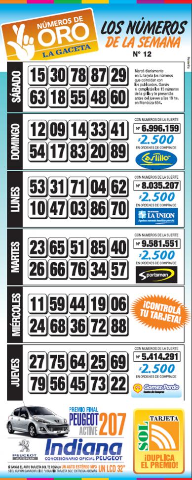 Como todas las semanas, aquellos lectores que completen los 15 números de una de las grillas de su tarjeta de Números de Oro deben presentarse por calle Mendoza 654 hasta este jueves a las 18, que cierra la semana número 12 de Números de Oro. En caso de que la tarjeta ganadora tenga la leyenda Usuario Tarjeta Sol, duplica el premio.