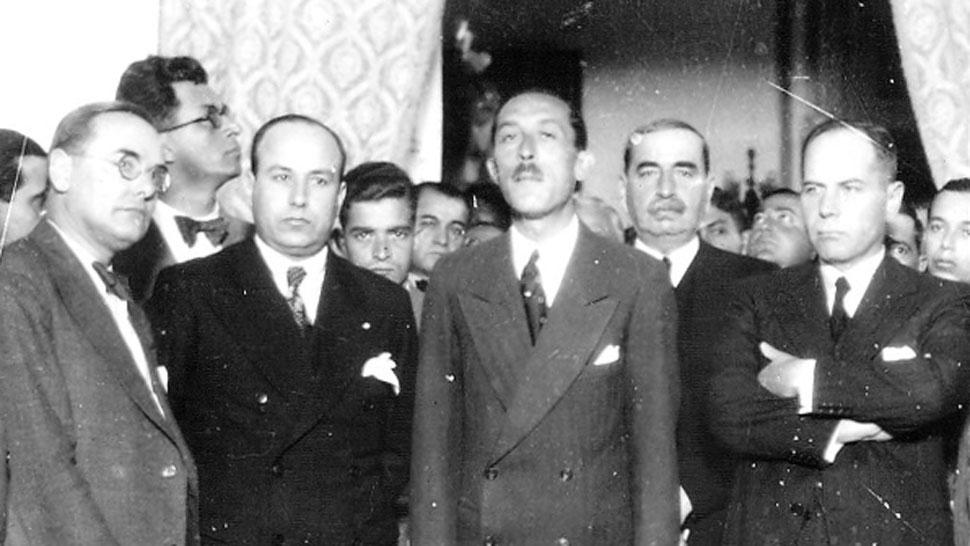 DELFÍN VALLADARES. Como escribano de Gobierno, aparece a la izquierda, con la mano apoyada en la mesa. Al centro, hablando, el gobernador Juan Luis Nougués. la gaceta / archivo