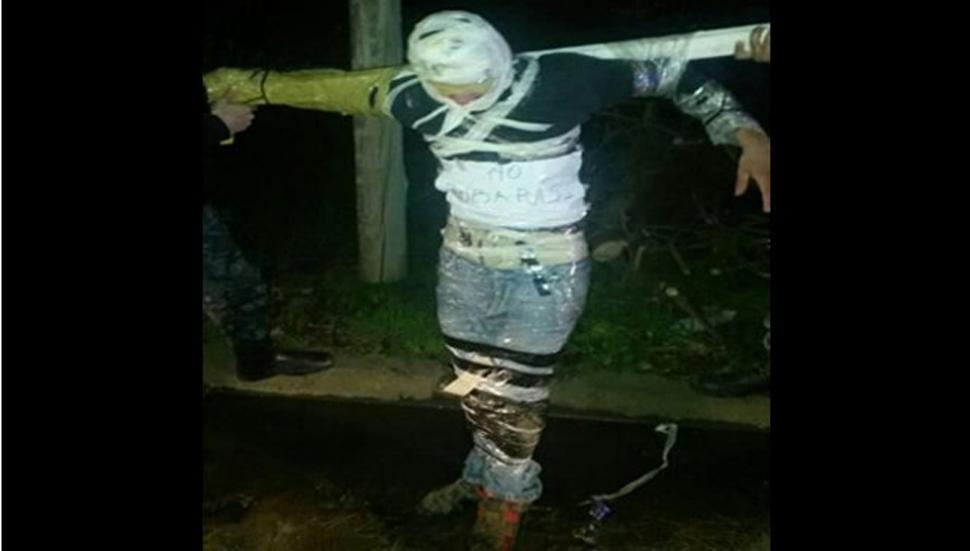 Según trascendió, el supuesto delincuente, de 27 años, fue encontrado en la vía pública con algunos golpes, cubierto con cinta de embalaje y atados sus brazos y manos a una cruz armada con dos trozos de madera. Además, le habían colgado un cartel escrito a mano con una leyenda que decía: "No robarás", informó el sitio Lavozdesanjunto.com