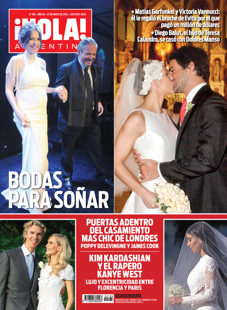 Reservá LA GACETA de mañana porque trae opcional la revista “¡Hola! Argentina”. Como anticipo, te contamos que la tapa muestra cuatro bodas de ensueño que ocurrieron en los últimos días: la del empresario Matías Garfunkel y Victoria Vannucci, que después de tres años sellaron su amor con una fiesta para 140 invitados. Como regalo de bodas él le dio el broche “Sol de Mayo”, la pieza de zafiros y brillantes que la firma Van Cleef & Arpels diseñó especialmente para Evita en 1949, valuado en un millón de dólares. Las otras parejas son las de Diego Balut (hijo de Teresa Calandra) y Dolores Manso; la de la inglesa Poppy Delevingne y el empresario James Cook, y la de la mediática Kim Kardashian y el rapero Kanye West. Todas se desarrollaron entre el lujo y la excentricidad.
