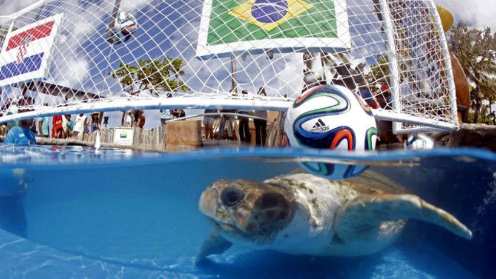 En un refugio de tortugas ubicado en el balneario de Praia do Forte, unos 100 kilómetros al norte de Salvador, esta tortuga macho de 25 años debió elegir entre comerse un pescado que pendía de una bandera brasileña u otro colgado de una bandera de Croacia. Después de que sólo intentó comer el pescado colocado en un balón, con lo que hubiera pronosticado un empate, Big Head terminó inclinándose por la bandera de Brasil.