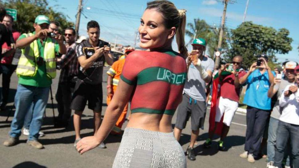 BRASIL.- La mujer de moda en Brasil, Andressa Urach,llamó la atención de todos en las vísperas de la inauguración de la Copa del Mundo tras recibir con un 'bodypaint' a la selección de futbol de Portugal la cual aterrizó en Campinas.
