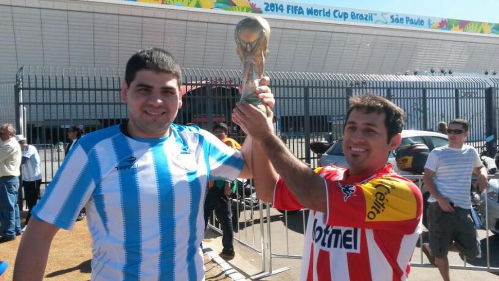 “La verdad es que no tenía ánimo para viajar, se me habían ido las ganas”, confiesa Matías, empleado del banco HSBC. “Más allá de que el viaje estaba pagado, fue la insistencia de mi familia la que me impulsó a venir”, agrega. “Pero, sobre todo, este viaje es un homenaje a Ricardo”, resalta Alejandro, empleado de Coca Cola. A Matías le cuesta hablar y por eso levanta la Copa. Alejandro lo acompaña. Son gestos que lo dicen todo.