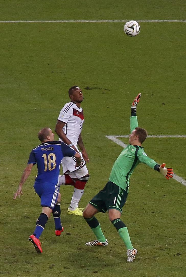 Luego, fue Palacio el del “no-gol” increíble. El ex delantero de Boca Juniors volvió a estar cerca de marcar a los 97, cuando definió por encima de Neuer tras bajar la pelota con el pecho. El centro desde la izquierda sobró al último defensor y Palacio la bajó, pero la pelota se le fue larga y, al intentar colocarla por encima del cuerpo del arquero, le pegó con la canilla y el balón salió a un costado. En la semi con Holanda, Palacio falló un mano a mano similar, aunque aquella vez cabeceó a las manos del uno naranja.