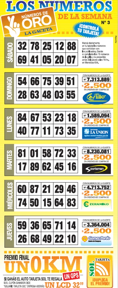 Como cada jueves, se publicó la grilla completa de los Números de Oro de LA GACETA para que los lectores puedan revisar sus tarjetas. Aquellos que completen los 15 números de una de las grillas de su cartón de Números de Oro deberán presentarse en calle Mendoza 654 hasta las 18, que cierra la semana número 3 de Números de Oro. En caso de que la tarjeta ganadora tenga la leyenda Usuario Tarjeta Sol, duplica el premio.
