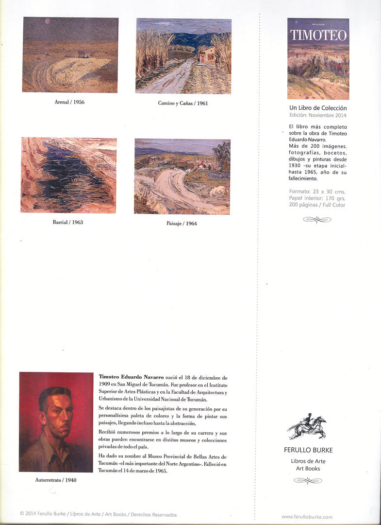 Con el simple título de “Timoteo”, la publicación es el segundo emprendimiento de la editorial Ferullo Burke e integra una colección dedicada a los grandes maestros de nuestra provincia que comenzó con el tomo sobre Aurelio Salas. En esta oportunidad, Daniel Ferullo, diseñador y editor de la obra, contó con la colaboración de Cristina Navarro, hija del destacado pintor. “La primera tirada será de 500 ejemplares y, al igual que el libro anterior, saldrá al mercado en dos versiones: una de lujo y otra más económica”, señaló Ferullo.