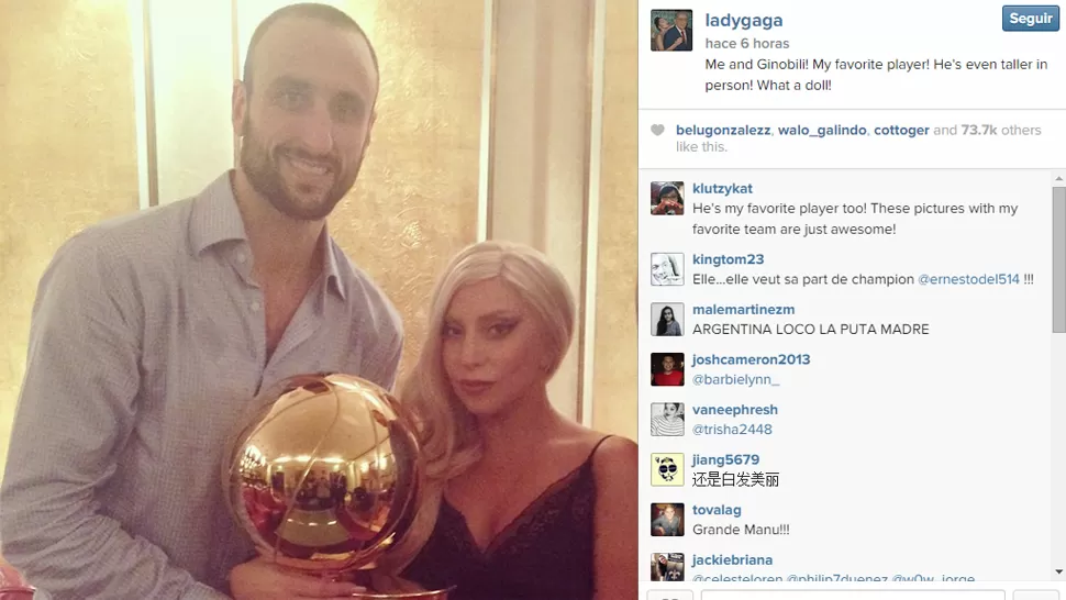 "Ginóbili y yo! Mi jugador favorito! Él es incluso más alto en persona! ¡Qué muñeco!", fueron los elogios de Gaga hacia "Manu", que a los 37 años, y con cuatro anillos de campeón junto a Spurs, va camino a convertirse en una leyenda del básquet.