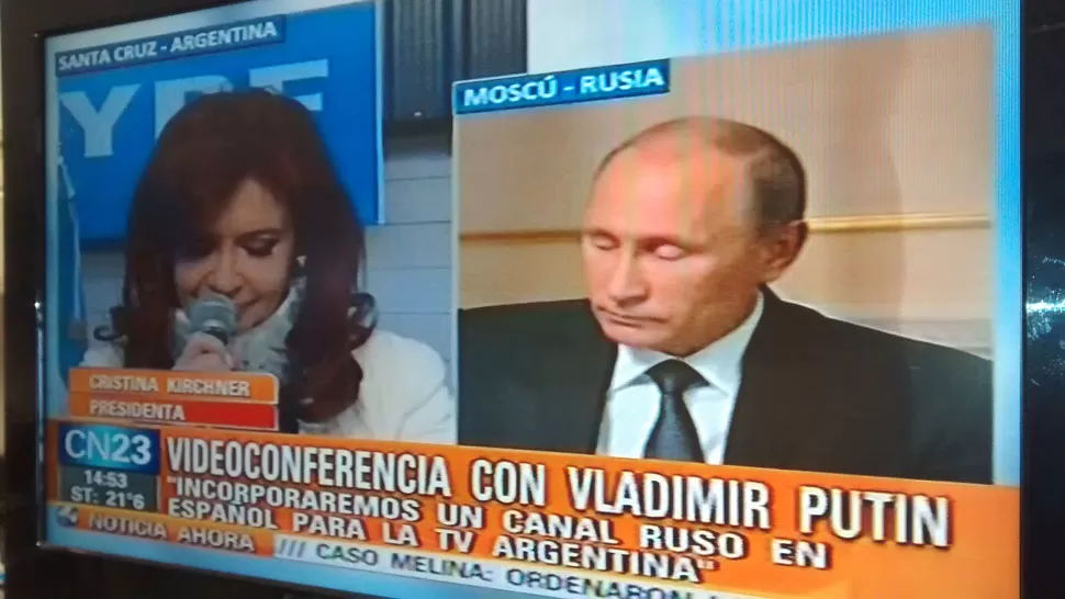 BUENOS AIRES.- La presidenta, Cristina Fernández, y el mandatario de la Federación Rusa, Vladimir Putin, mantuvieron un diálogo a través de una teleconferencia y anunciaron la incorporación del canal RT de Rusia (en versión en español) a la grilla de la Televisión Digital Abierta (TDA) de Argentina.