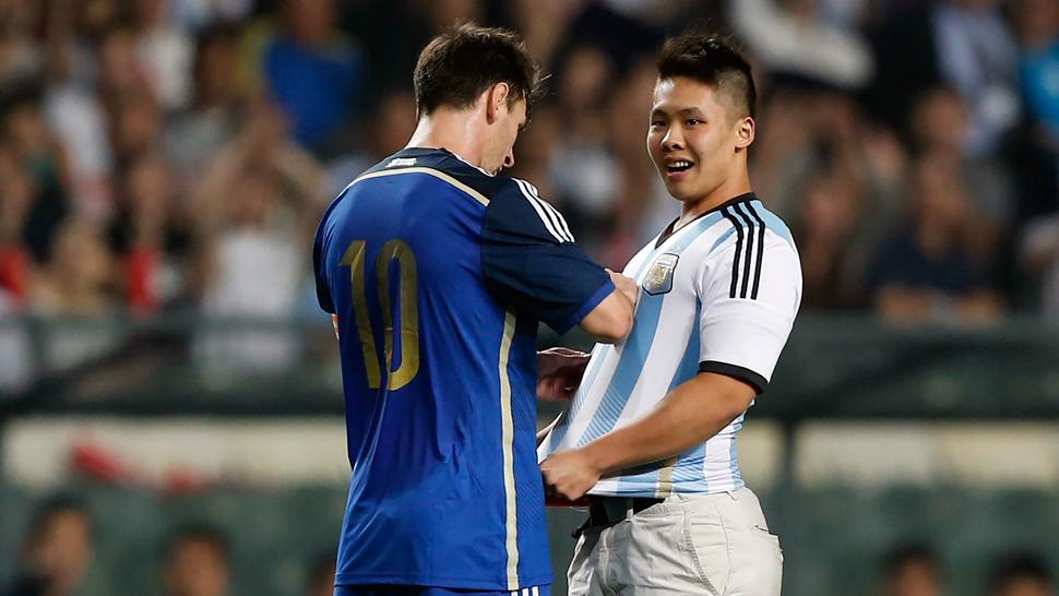 HONG KONG, China.- El partido entre Argentina se terminaba y el 7-0 ante Hong Kong era lapidario. Pero nada de eso le importó a un joven que burló a los encargados de la seguridad y saltó hasta el campo de juego del Hong Kong Stadium. El premio era llegar hasta Lionel Messi, estrella de Barcelona y de la Selección. Ya frente al rosarino, el fanático sacó un marcador y le pidió a la "Pulga" que le estampe su autógrafo en el pecho. Unos segundos después, el intrépido muchacho fue sacado de la cancha. Eso sí, nadie le va a quitar su camiseta autografiada por el mejor del mundo.
