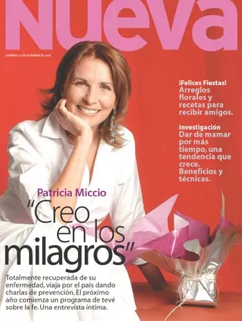 En una nota que publicará este domingo la revista "Nueva", la ex modelo y actual conductora Patricia Miccio cuenta que cree en los milagros y adelanta que el próximo año conducirá un nuevo programa de televisión que girará en torno de la fe. Totalmente recuperada de su enfermedad, la artista recorre todo el país dando charlas para prevenir el cáncer de mama. Además, la revista trae la particular historia de un grupo de Río Negro que hace teatro en las alturas.