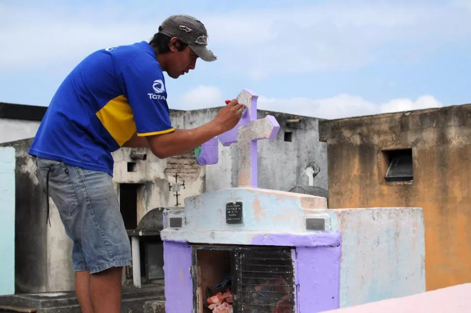 Una contracara del camposanto de Colombres es el Cementerio Municipal de Tafí Viejo: no había brazos familiares, sino de empleados, realizando las tareas de mantenimiento en los ostentosos monumentos. “Las cosas ya no son como antes. Uno se muere, y a los pocos días ya los familiares se olvidan”, resume Raúl Quintana, un “changarín” dedicado a hacer todo tipo de tareas en el cementerio: “desde desagotes de cajones, hasta repintado de piedras”, cuenta. El viernes, Raúl repintaba una tumba, contratado por una familia taficeña.