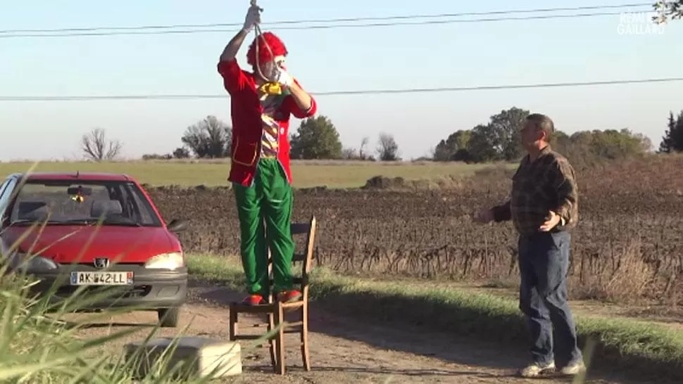 Caracterizada como uno personaje circense, se muestra dispuesto a quitarse la vida para intentar llamar la atención de su “víctima”. Una vez que este se acerca e intenta dialogar, el sorprende con un tortazo, antes de comenzar a correr.