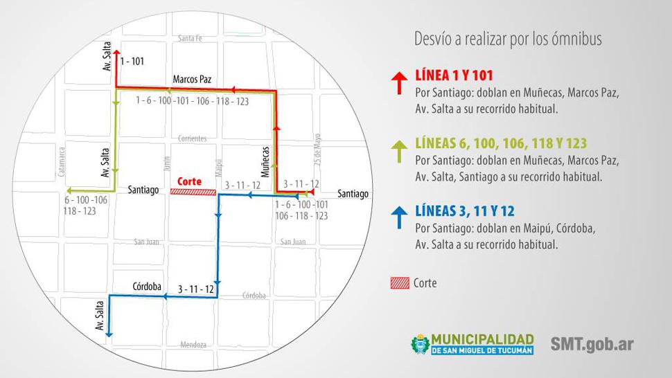 - Líneas 6, 100, 106, 118, 123, por Santiago, seguirán por Muñecas, Marcos Paz, Salta, y Santiago a su circuito.
