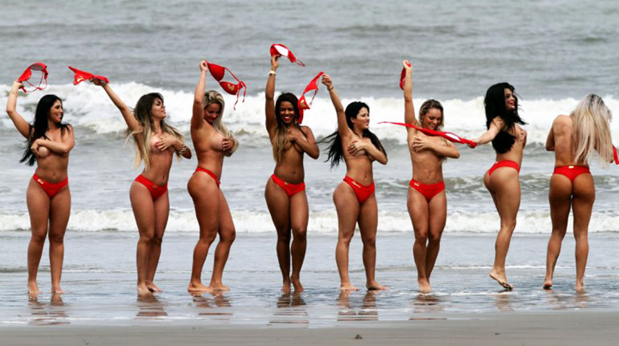 La sesión para el infarto tuvo lugar en Guarajá, y en las imágenes se puede ver a las modelos mostrando sus curvas, divirtiéndose junto al mar y lanzando la parte superior de sus trajes de baño al aire.
