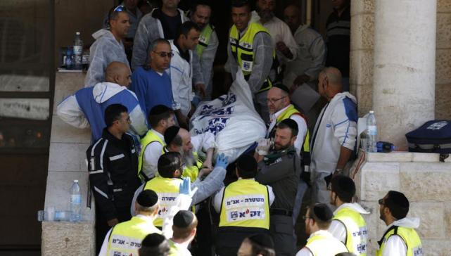 El ataque se produjo poco después del amanecer en un barrio ultraortodoxo de Jerusalén Oeste. Fotos publicadas en internet por un portavoz del Ejército israelí mostraron a un hombre en un chal de oración judío muerto y tendido en el piso, una cuchilla de carnicero ensangrentada tirada en el suelo y mesas de oración volcadas.