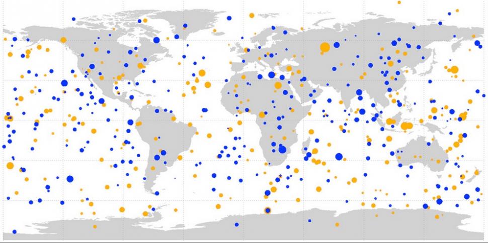 Aquí se pueden apreciar todos los impactos registrados de asteroides en los 20 años, entre 1994 y 2013, y son muchos más de los que cabe imaginar. En total son nada menos que 556, y afortunadamente casi todos ardieron antes de entrar a la atmósfera, librando a la tierra de catastróficas consecuencias.