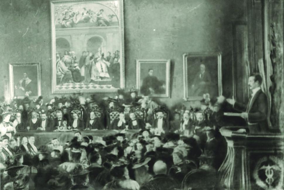 ABOGADO TUCUMANO. La borrosa foto de 1896, muestra al joven letrado Ernesto Padilla hablando, desde el púlpito de la vieja Facultad porteña, en nombre de los graduados. la gaceta / archivo