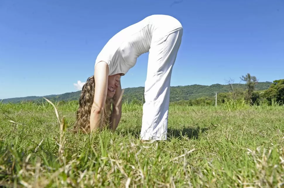 En sánscrito, esta posición se denomina uttasana (utt se traduce como extender, y asana significa postura). Después de haberse desperezado, con el ancho de piernas todavía a la abertura de la cadera, el corredor tiene que llevar su columna hacia adelante, y dejarla colgar. Es importante mantener la mandíbula floja, flexionar ligeramente las rodillas y hacer que las manos toquen el suelo. Realizar 10 respiraciones calmas, con inhalación y exhalación del aire a través de la nariz.