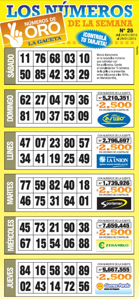Como cada jueves, se publicó la grilla completa de los Números de Oro de LA GACETA para que los lectores puedan revisar sus tarjetas. Aquellos que completen los 15 números de una de las grillas de su cartón de Números de Oro deberán presentarse en calle Mendoza 654 hasta las 18, que cierra la semana número 25 de Números de Oro. En caso de que el ganador sea usuario Tarjeta Sol, duplica el premio.